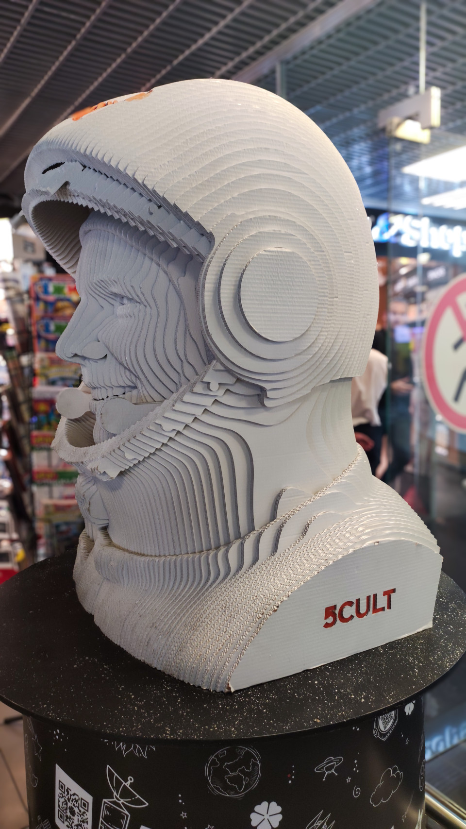искусство инсталляция арт объект скульптура современный дизайн бюст портрет Юрий Гагарин Гагарин космонавт космонавтика космос шлем 3D печать 3D print пластик слоистая фактура декор витрина подсветка стойка современный интерьер общественное пространство терминал аэропорт технологии дизайн футуризм экспозиция памятный образ СССРПохожие фотографии