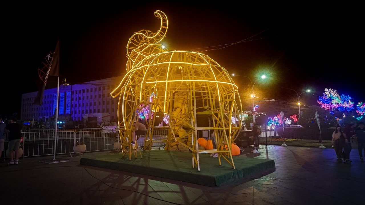 искусство инсталляция арт объект скульптура современный дизайн город ночь площадь общественное пространство иллюминация световая инсталляция уличное искусство декоративная скульптура слон световая фигура гирлянды тёплый свет фотозона городской декор фестиваль огней культурное мероприятие люди зрители прогулка лавочки ограждения кабель разноцветная подсветка световые деревья вечерняя атмосфера туризм урбанистика репортажПохожие фотографии