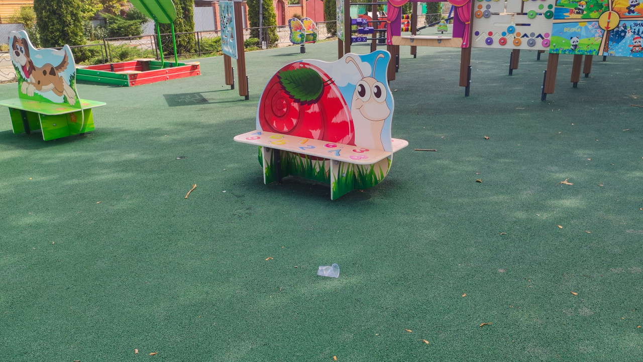 благоустройство детская площадка детские развлечения детский отдых детский досуг детское оборудование игровая зона игровое оборудование игровая площадка игровой комплекс развлечение физическая активность город двор городская среда инфраструктура общественное пространство резиновое покрытие резиновая крошка безопасное покрытие уличное покрытие скамейка детская скамейка лавочка улитка декоративная фигура мультяшный дизайн яркие цвета развивающая панель игровой стенд ограждение деревья тень мусор пластиковый стаканчик уборка территории чистота семейный отдыхПохожие фотографии