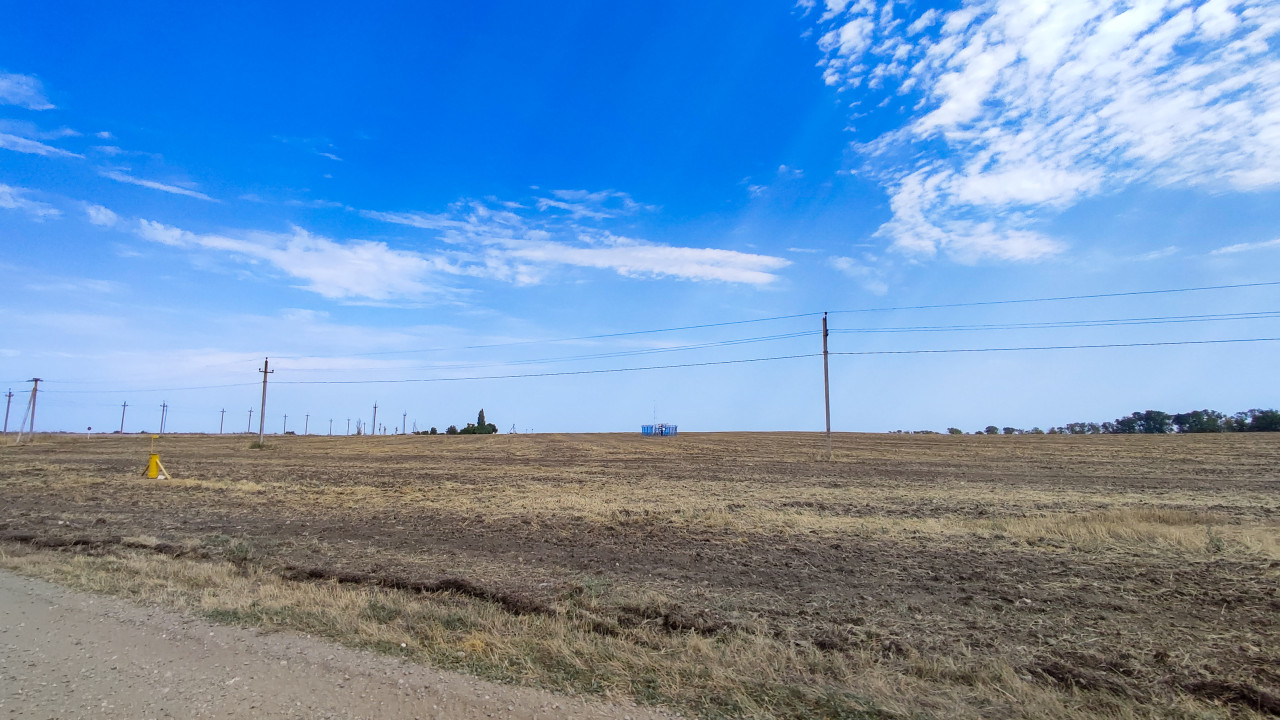 Открытое убранное поле под линиями электропередачи: на переднем плане сухая почва и стерня, слева виден край грунтовой колеи у обочины. Через весь кадр тянутся провода, опирающиеся на ряд бетонных или деревянных столбов, уходящих к горизонту. На дальнем плане заметны небольшие строения и полосы растительности, а сверху большое голубое небо с кучевыми облаками. Фото хорошо иллюстрирует сельскую инфраструктуру и энергетику, подойдёт для материалов о ЛЭП, коммуникациях, сельском хозяйстве и пейзажах.