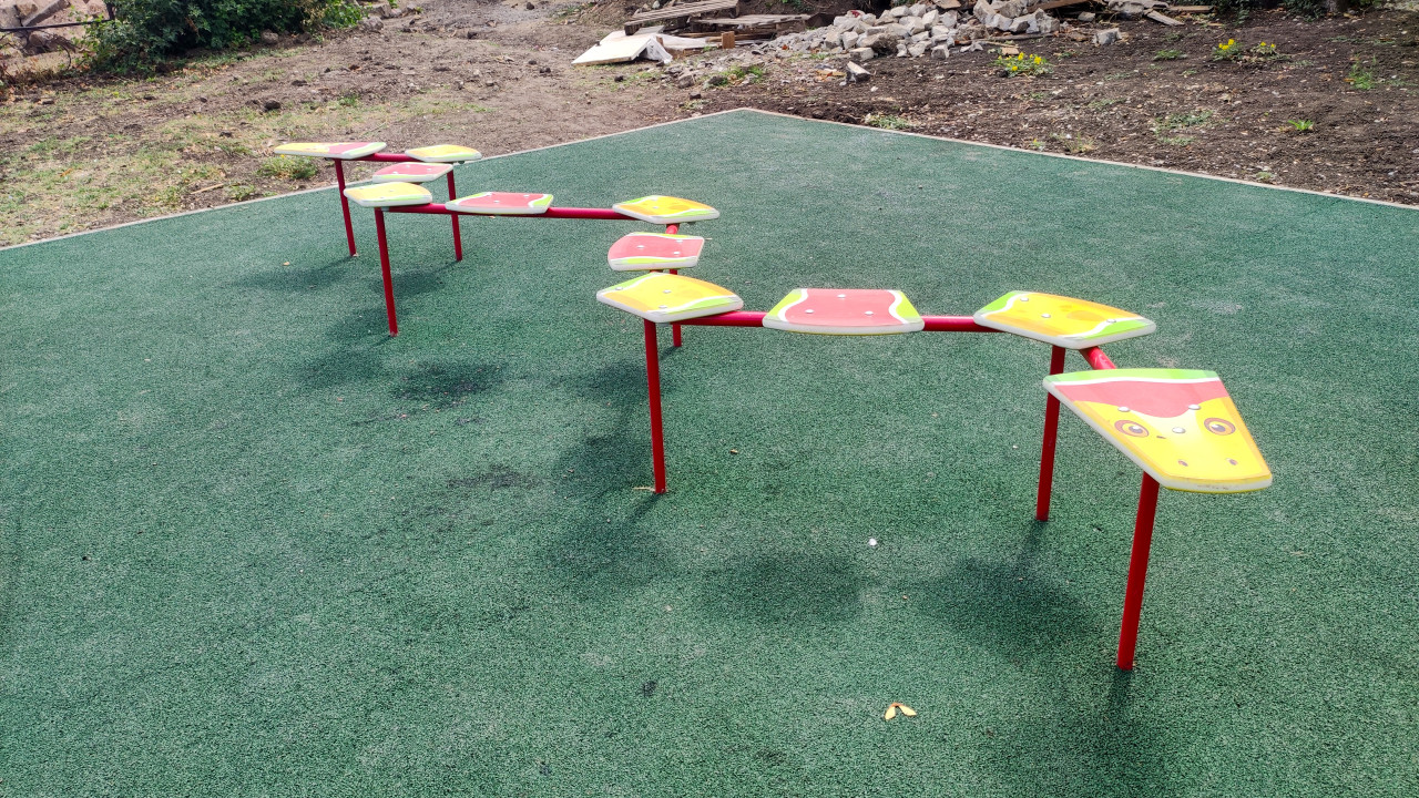 На снимке баланс-тропа: ряд разноцветных платформ на красных металлических стойках, собранных в извилистый маршрут, крайняя платформа оформлена как «голова» персонажа. Площадка покрыта зелёным искусственным настилом, местами видны тёмные следы и пятна, по краю начинается грунт и строительный мусор: камни, доски, обрезки материалов. Компоновка подчёркивает тренировку координации и аккуратное крепление элементов к основанию. Фото подойдёт для тем про детские площадки, развитие равновесия, уличные тренажёры для детей и качество благоустройства.