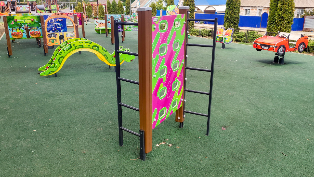 Игровой комплекс и качалка на зелёном резиновом покрытии во дворе