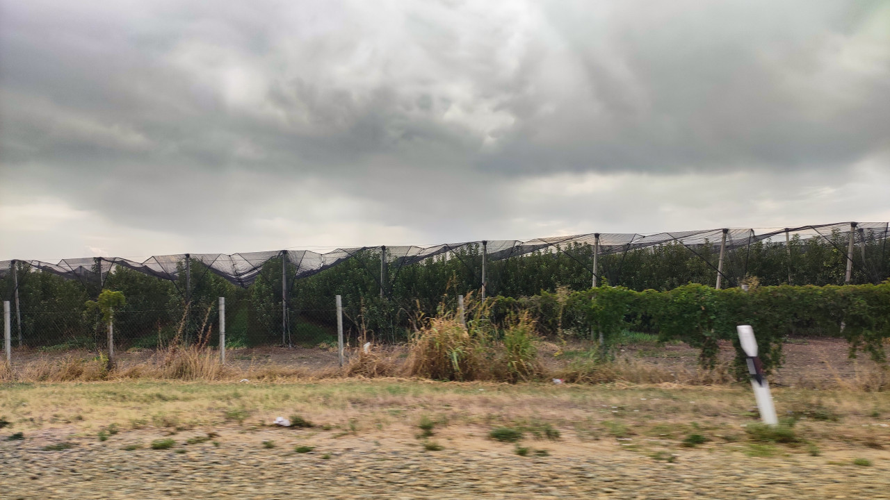 сельское хозяйство промышленное садоводство сад фруктовый сад плантация деревья ряды посадок защитная сетка сетка от птиц сетка от града опоры тросы ограждение забор обочина дорога дорожный столбик сельская местность фермерство агротехника выращивание урожай ландшафт пасмурное небо облака поля кустарники природа сельская инфраструктураПохожие фотографии