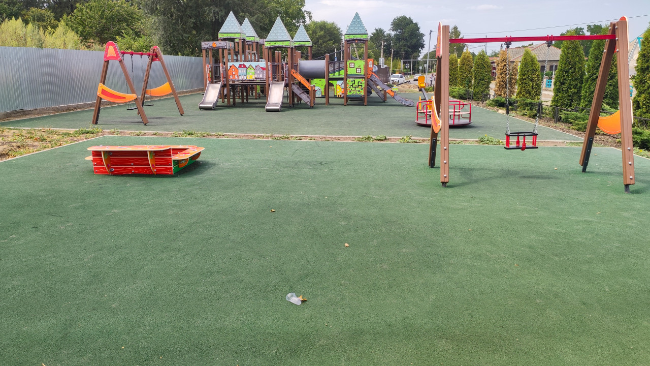 Спокойный летний день на игровой площадке в парке, дети отдыхают