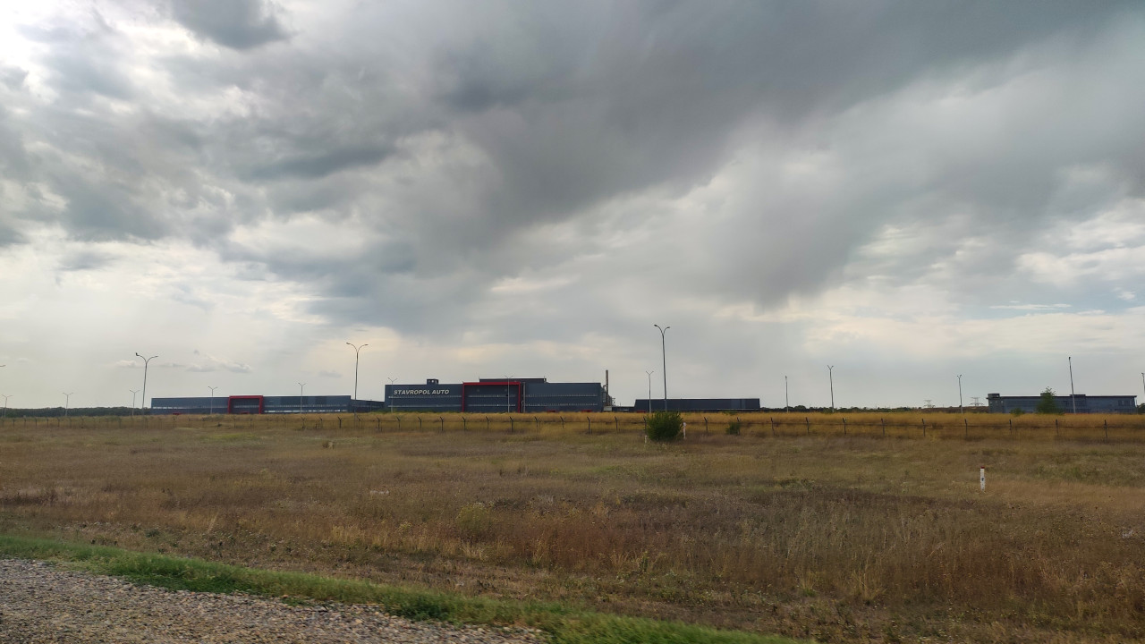 На горизонте виден большой промышленный комплекс с вывеской STAVROPOL AUTO: тёмные корпуса, красные акценты на фасаде и высокий светильник рядом. Перед зданиями тянется ограждение с наклонными стойками, внизу широкое поле с сухой травой и редкими кустами, у края проходит гравийная полоса. Небо драматичное, с тяжёлыми облаками и светлыми просветами, что добавляет ощущение простора и погоды «на подходе». Фото подходит для тем про складскую логистику, промзоны, индустриальные пейзажи и развитие пригородных территорий.