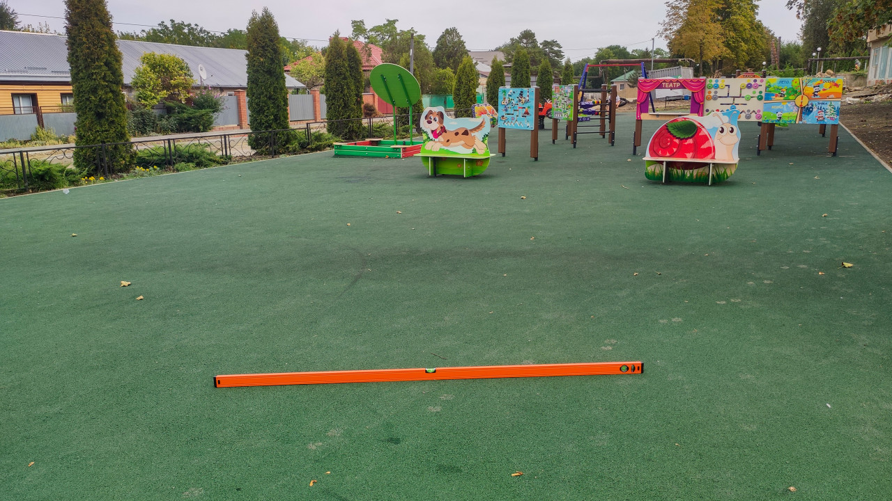 строительство благоустройство инфраструктура детская площадка игровое оборудование резиновое покрытие резиновая крошка зелёное покрытие строительный контроль контроль качества проверка измерения строительный уровеньПохожие фотографии