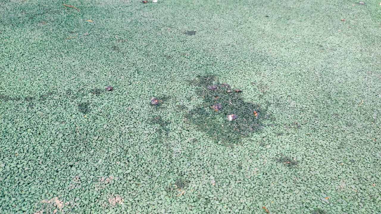 Вмятина на резиновом покрытии у уличного тренажера после повреждения