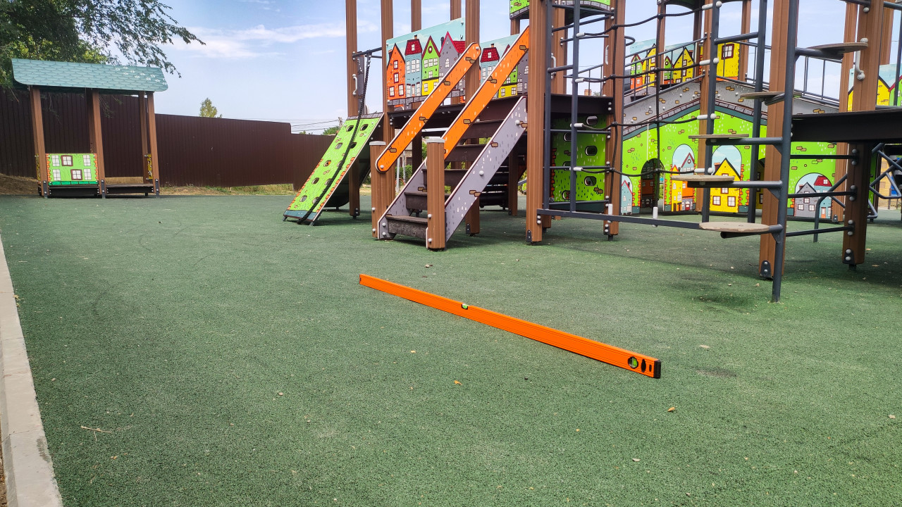 строительство благоустройство инфраструктура детская площадка игровое оборудование резиновое покрытие резиновая крошка зелёное покрытие строительный контроль контроль качества проверка измерения строительный уровеньПохожие фотографии