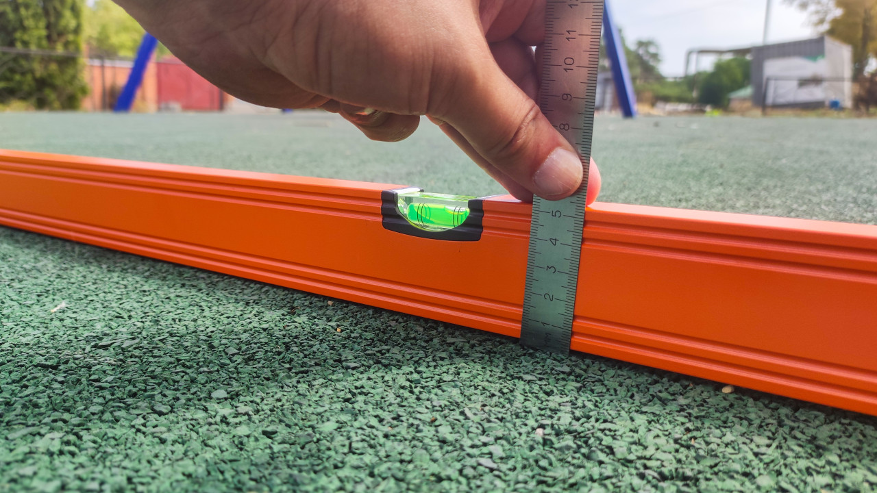 строительство благоустройство контроль качества приёмка работ измерение инструмент строительный уровень металлическая линейка резиновое покрытие резиновая крошка зелёное покрытие покрытие площадки детская площадка безопасностьПохожие фотографии