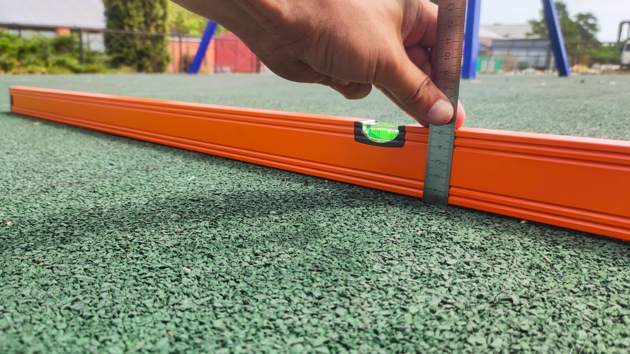 строительство благоустройство контроль качества приёмка работ измерение инструмент строительный уровень металлическая линейка резиновое покрытие резиновая крошка зелёное покрытие покрытие площадки детская площадка безопасностьПохожие фотографии