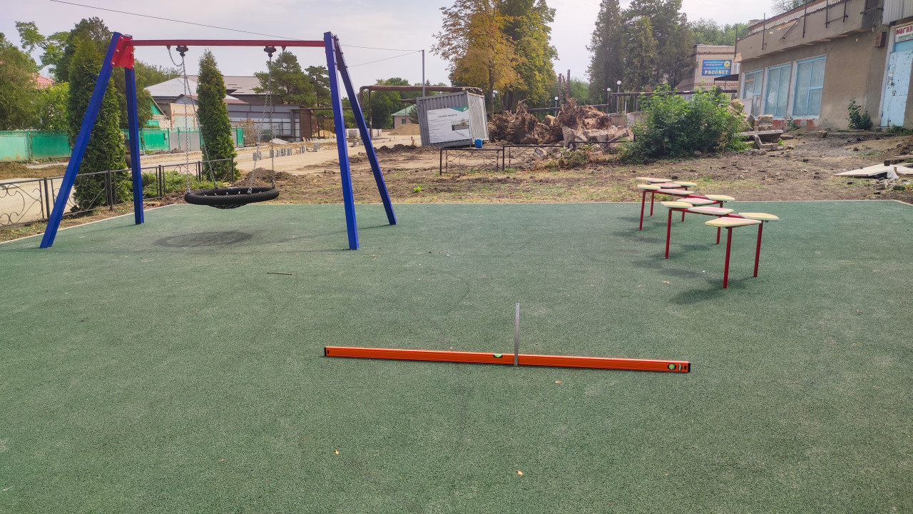 строительство благоустройство контроль качества приёмка работ измерение инструмент строительный уровень металлическая линейка резиновое покрытие резиновая крошка зелёное покрытие покрытие площадки детская площадка безопасностьПохожие фотографии