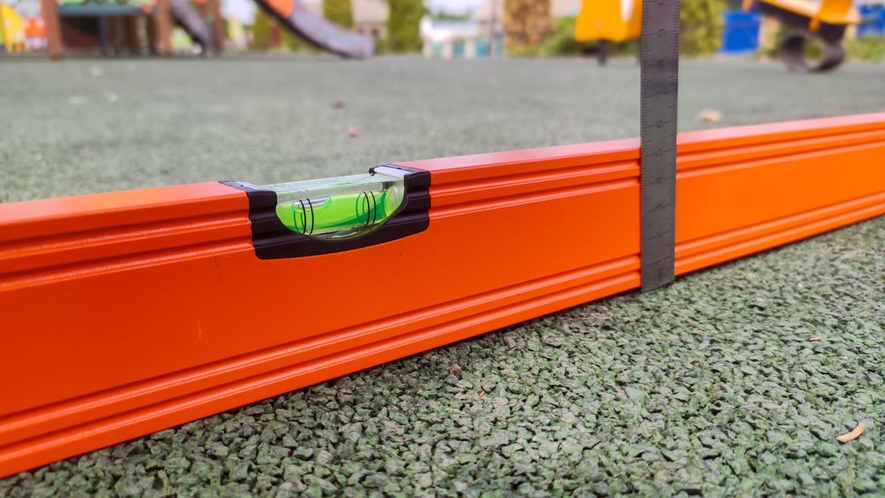 строительство благоустройство контроль качества приёмка работ измерение инструмент строительный уровень металлическая линейка резиновое покрытие резиновая крошка зелёное покрытие покрытие площадки детская площадка безопасностьПохожие фотографии