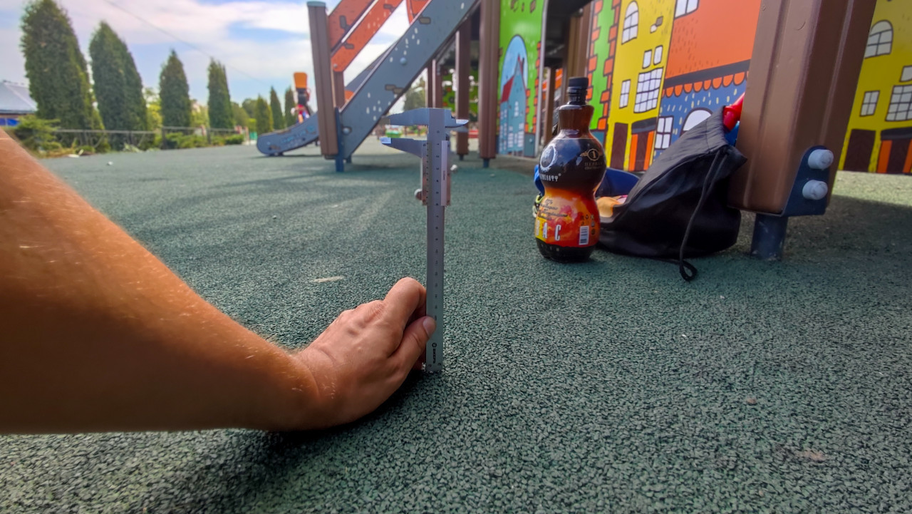 Измерение глубины ямы, находящегося под резиновым покрытием на спортивной площадке