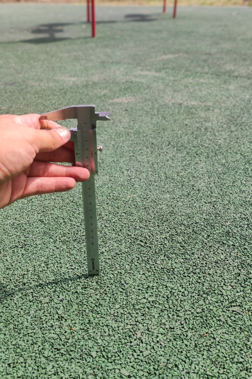 Крупный план на зелёном резиновом покрытии: рука держит металлический штангенциркуль, инструмент поставлен вертикально на поверхность, видна шкала и нониус. На заднем плане в размытии угадываются стойки игрового оборудования, а сама фактура резиновой крошки хорошо читается по всей площади кадра. Сцена выглядит как проверка параметров покрытия и контроль качества работ на площадке в посёлке. Фото можно использовать для статей о техническом надзоре, приёмке благоустройства, измерениях и безопасности детских площадок.