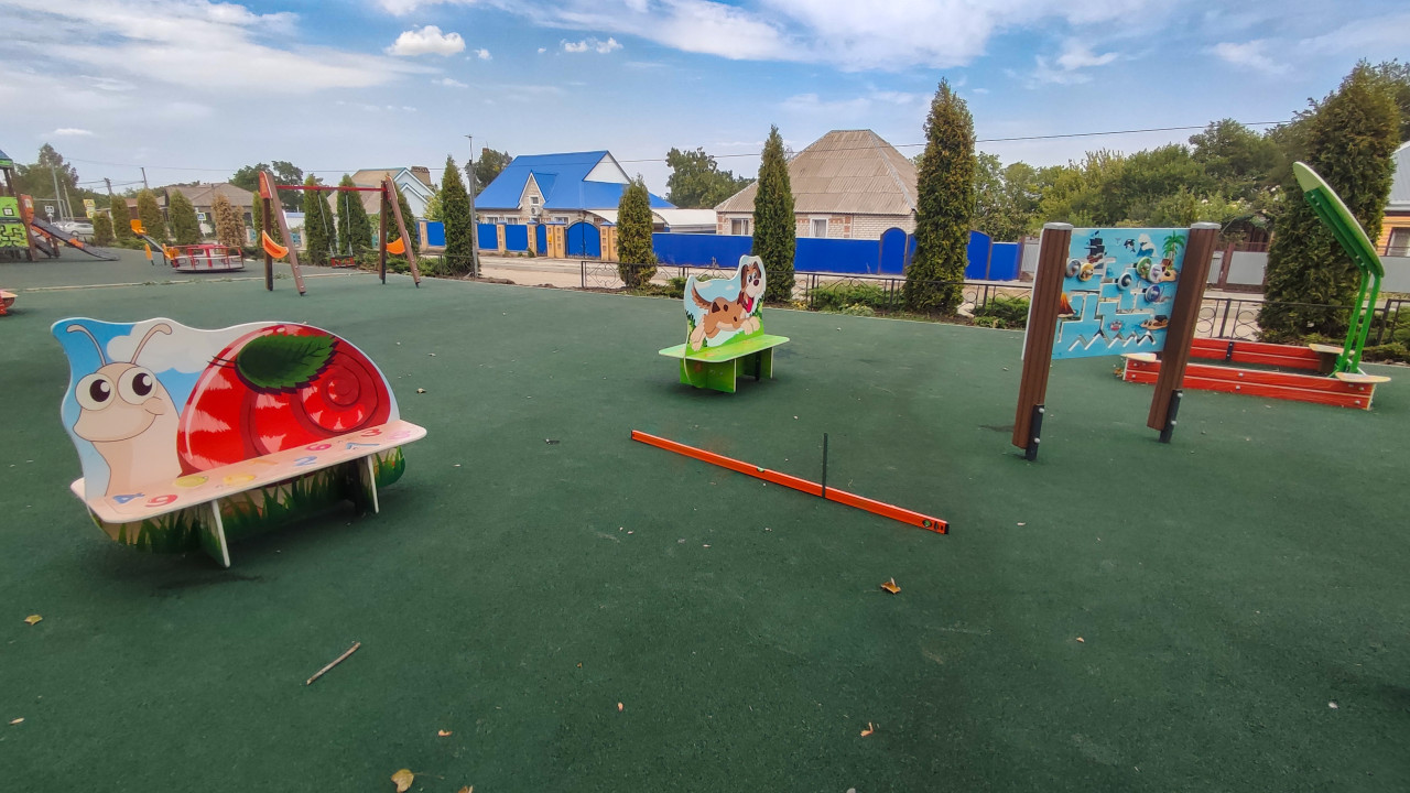 Широкий вид дворовой площадки: зелёное покрытие из резиновой крошки, ограждение по периметру и несколько игровых элементов. В кадре заметны фигурные уличные скамейки в виде животных, а также стенд-панель с игровыми деталями; дальше просматриваются качели и другие конструкции. На переднем плане лежит длинный оранжевый строительный уровень и стоит металлическая линейка, показывая процесс измерений и контроля качества покрытия. Снимок про благоустройство и безопасность детской среды. Фото можно использовать в материалах о ремонте детских площадок, приёмке работ и городской инфраструктуре.