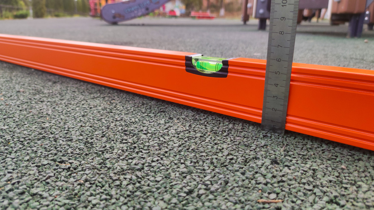строительство благоустройство контроль качества приёмка работ измерение инструмент строительный уровень металлическая линейка резиновое покрытие резиновая крошка зелёное покрытие покрытие площадки детская площадка безопасностьПохожие фотографии