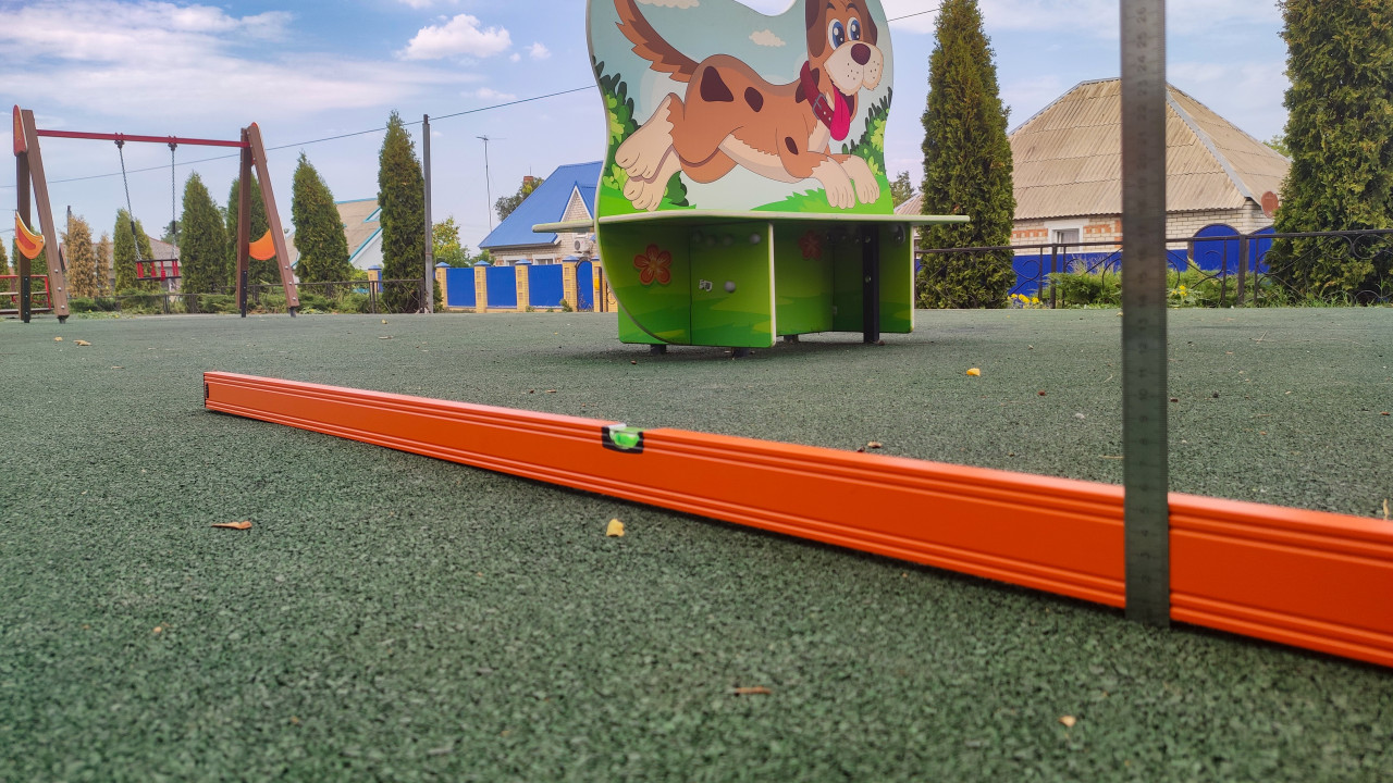 строительство благоустройство контроль качества приёмка работ измерение инструмент строительный уровень металлическая линейка резиновое покрытие резиновая крошка зелёное покрытие покрытие площадки детская площадка безопасностьПохожие фотографии
