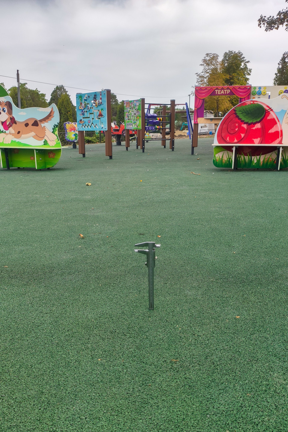 Строительный уровень на резиновом покрытии у борта спортивной площадки