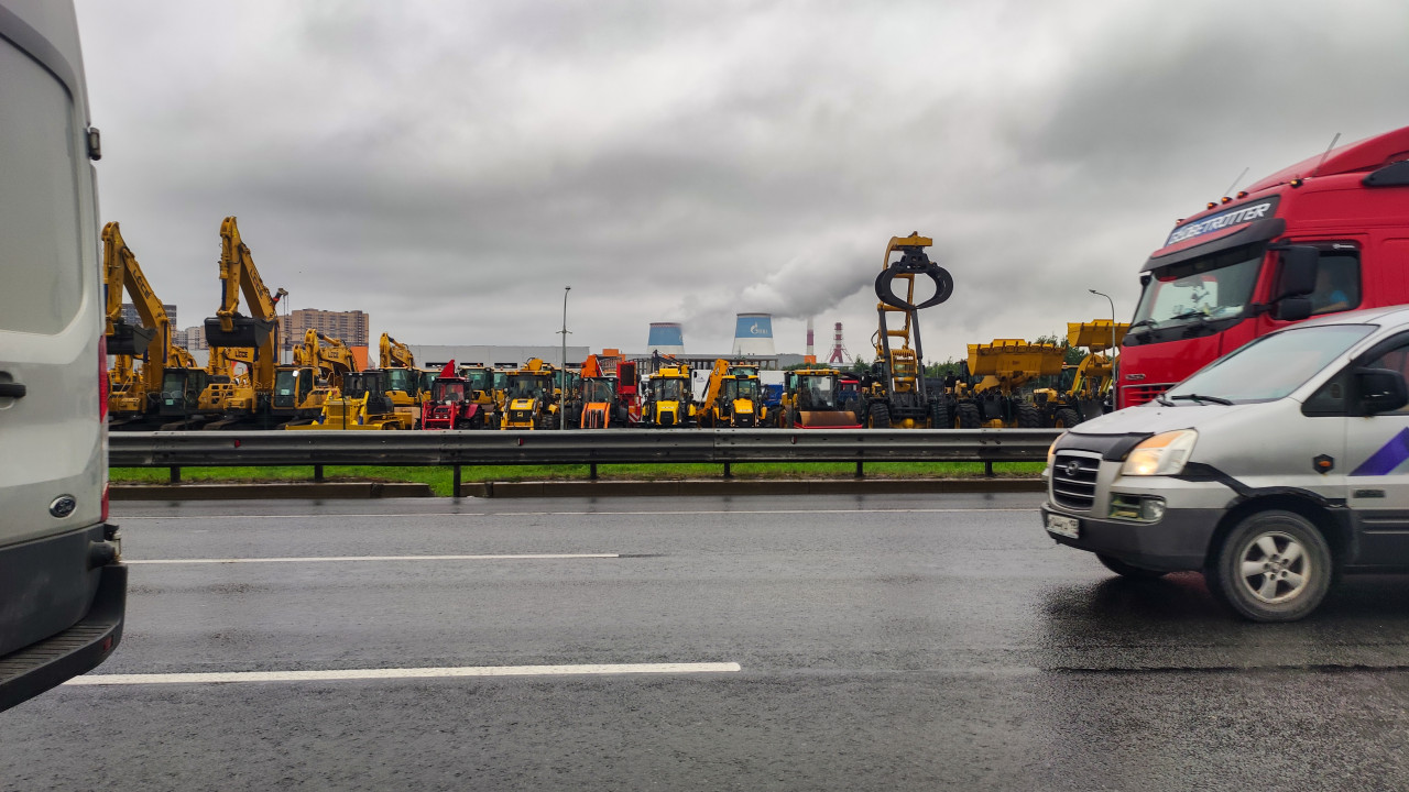 Плотное движение автомобилей на магистрали у промышленной зоны