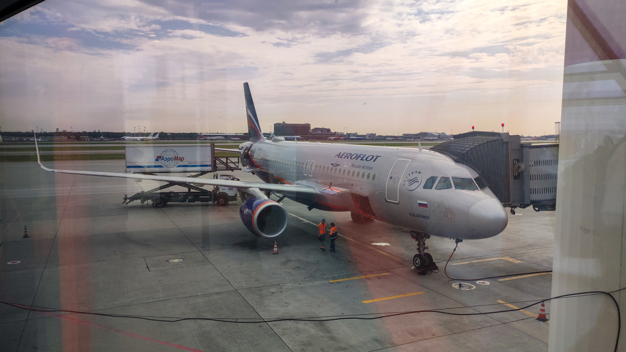 Пассажиры выходят из самолета в зимнем аэропорту
